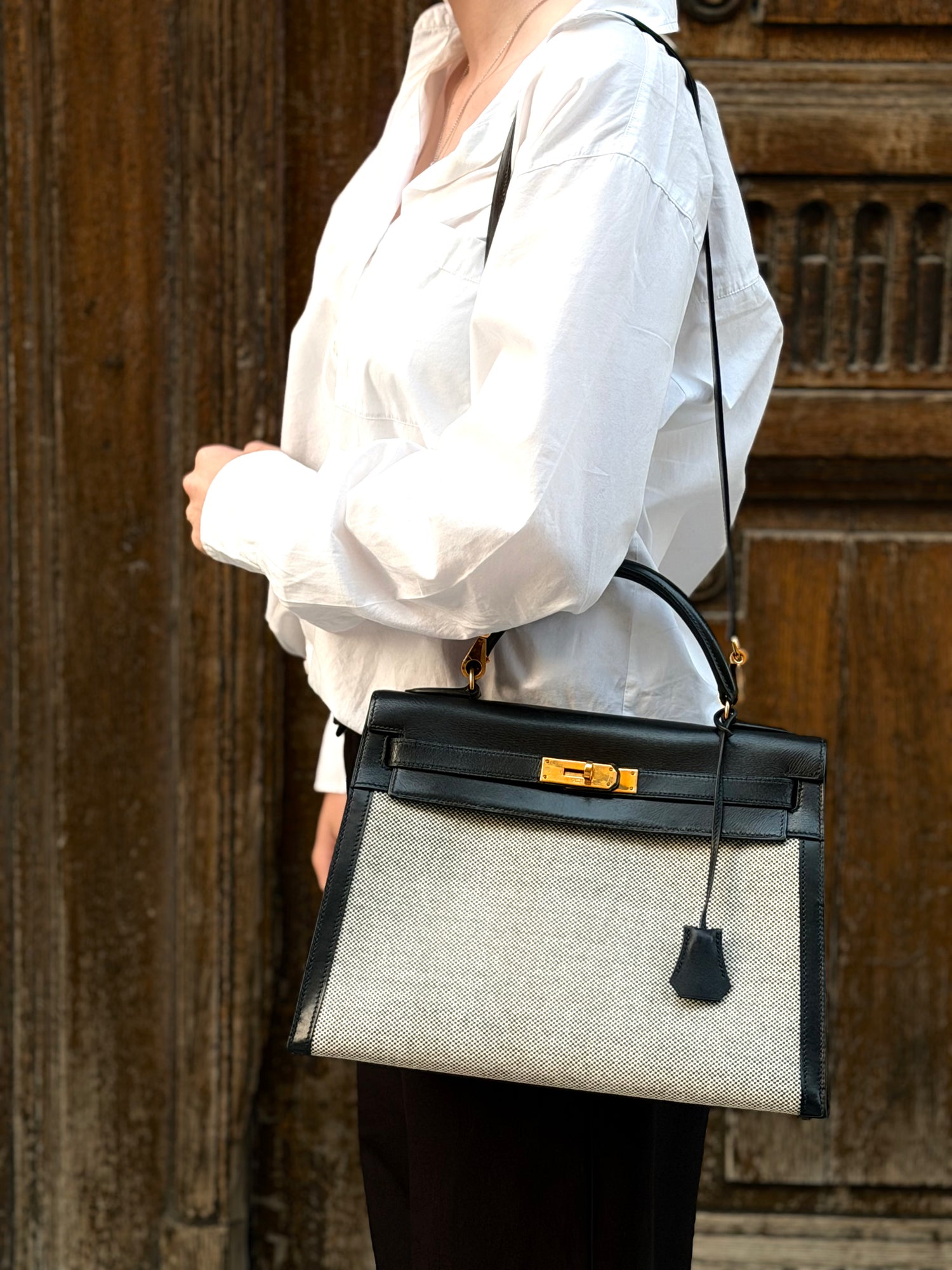 Symbole d’élégance intemporelle, le Kelly 32 se réinvente dans une version mêlant toile quadrillée et cuir Box. Le contraste entre la texture de la toile et l’éclat du cuir box souligne la construction précise et équilibrée du sac.