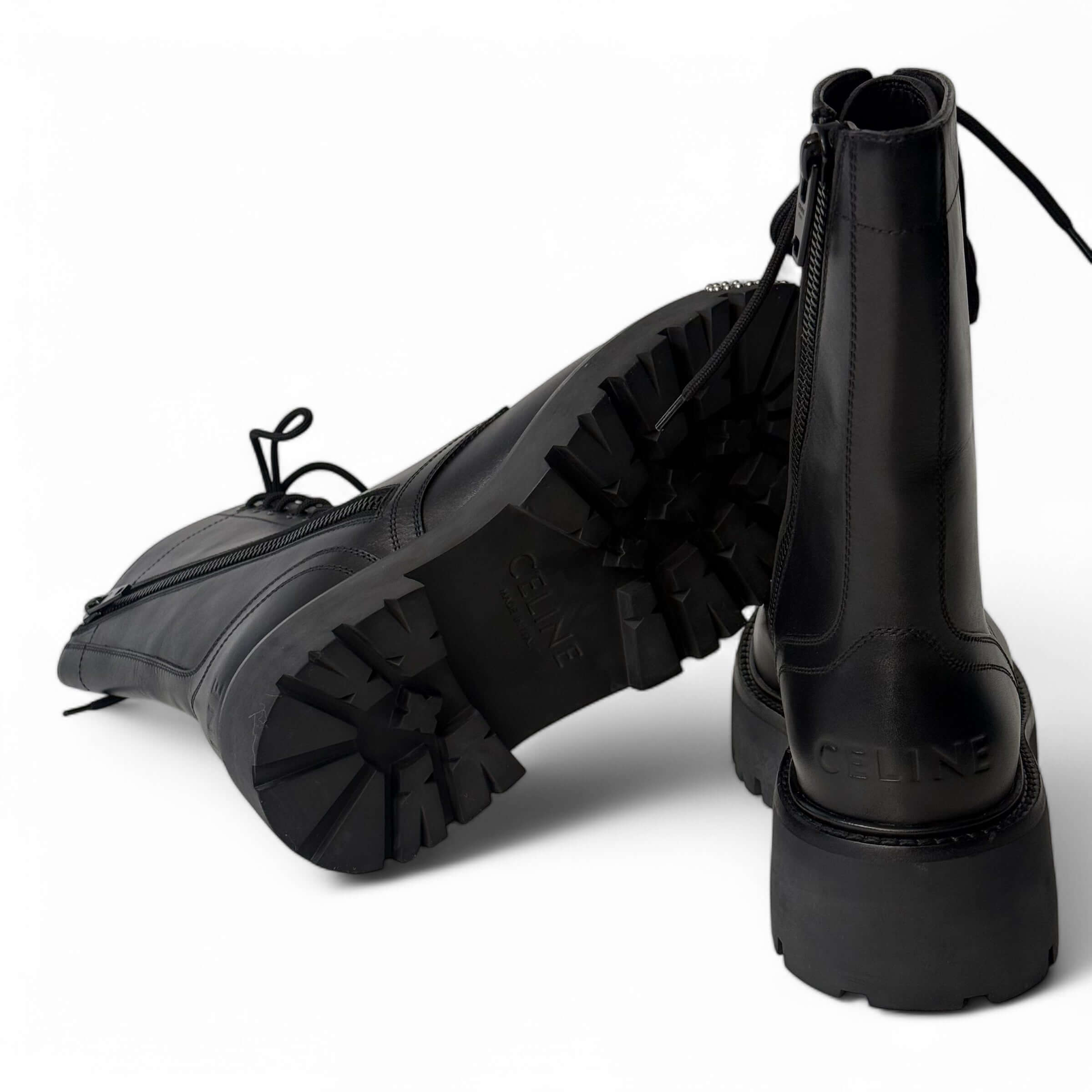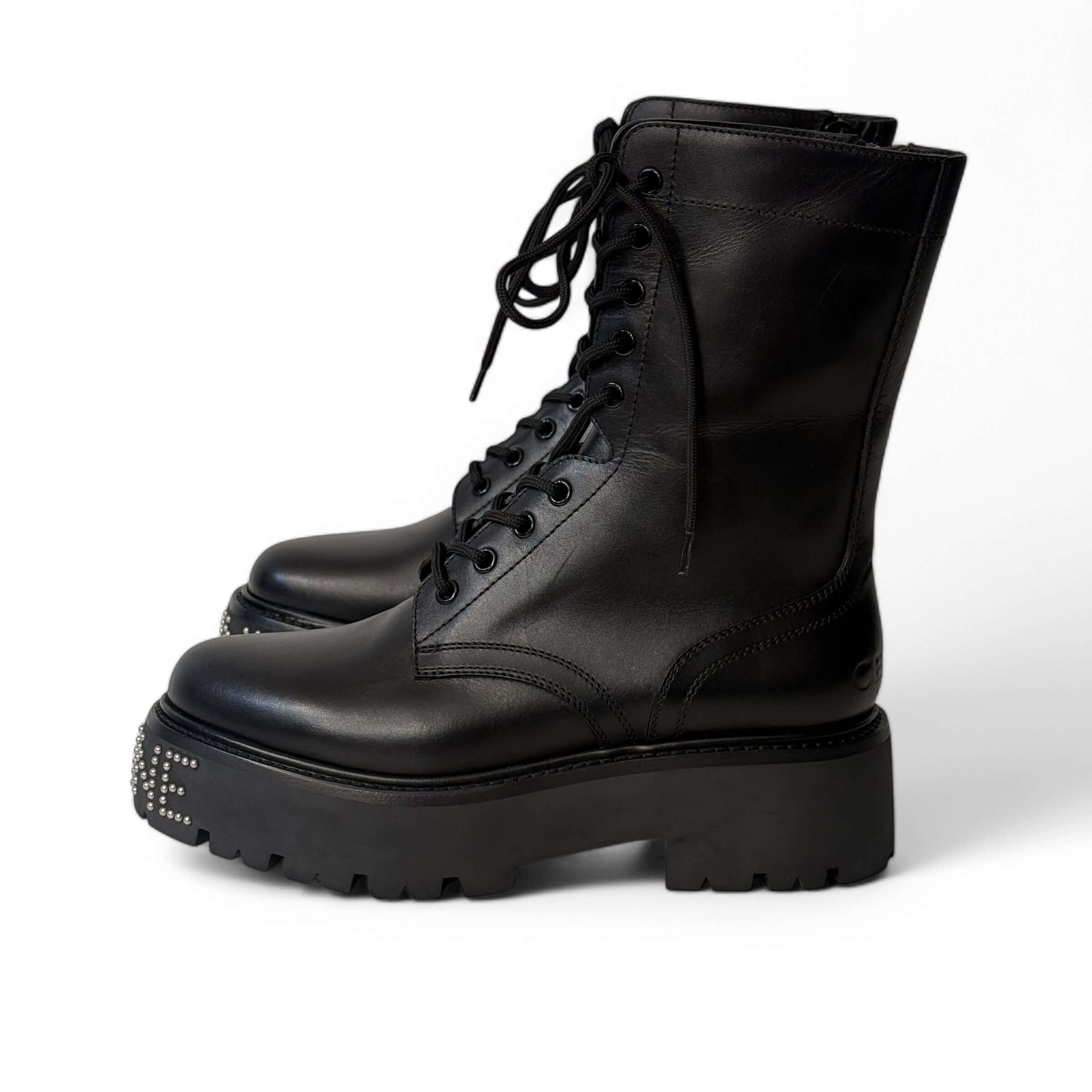 Wunderschöne Paar Lederstiefeletten mit Markeninschrift in Nieten auf der Vorderseite der Sohle, Reißverschluss und Schnürsenkeln.