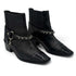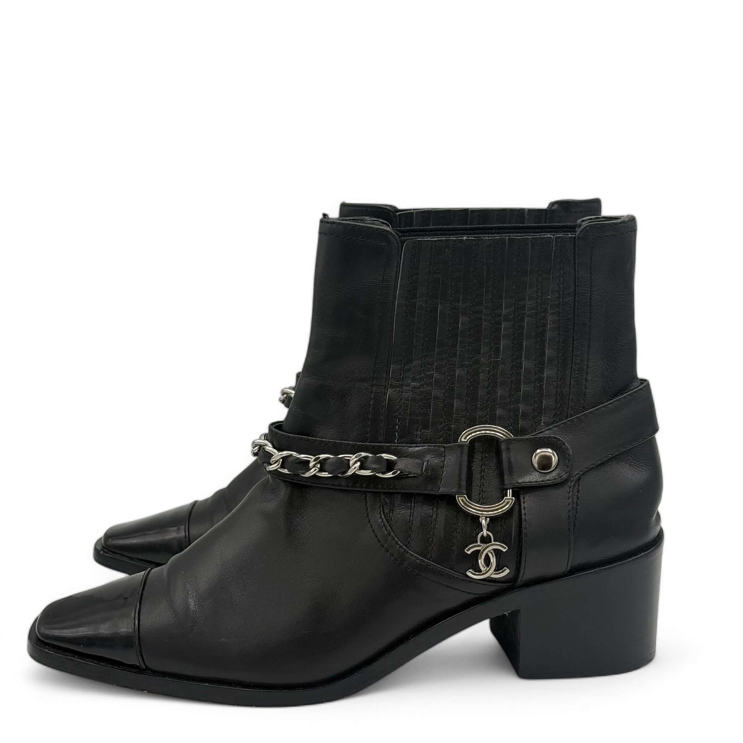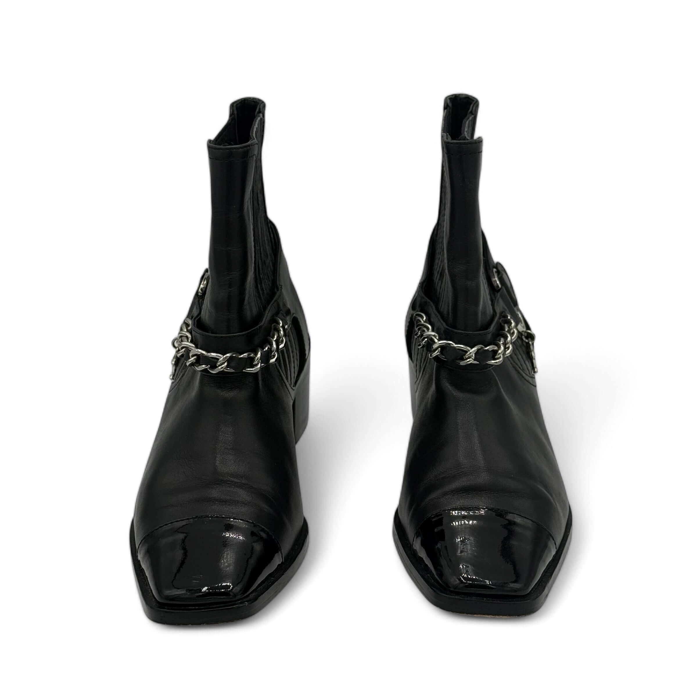 Schwarze Chanel Lederstiefeletten mit Kette und Logo-Anhänger, lackierte Spitze. Inspiriert von Santiags.