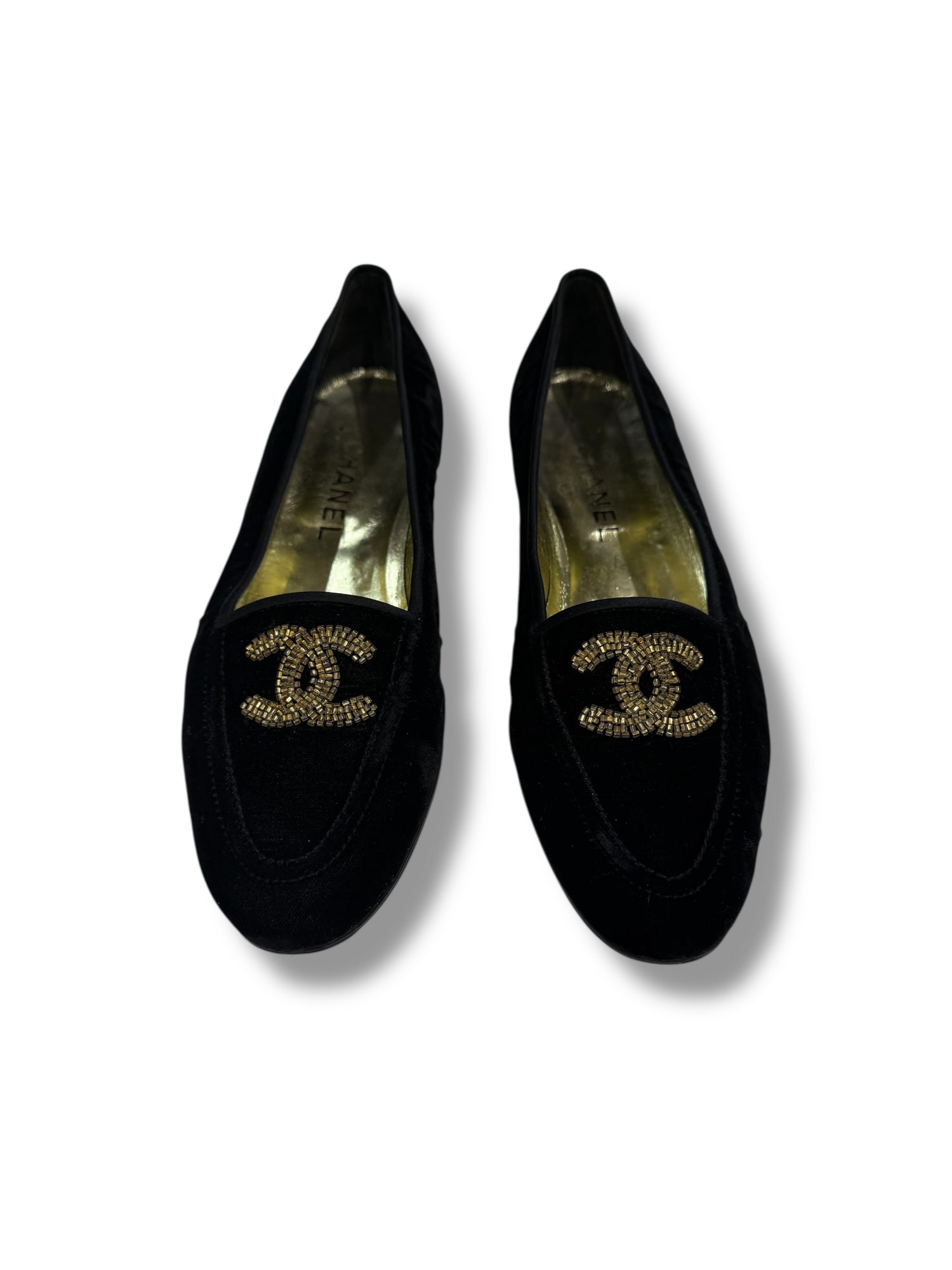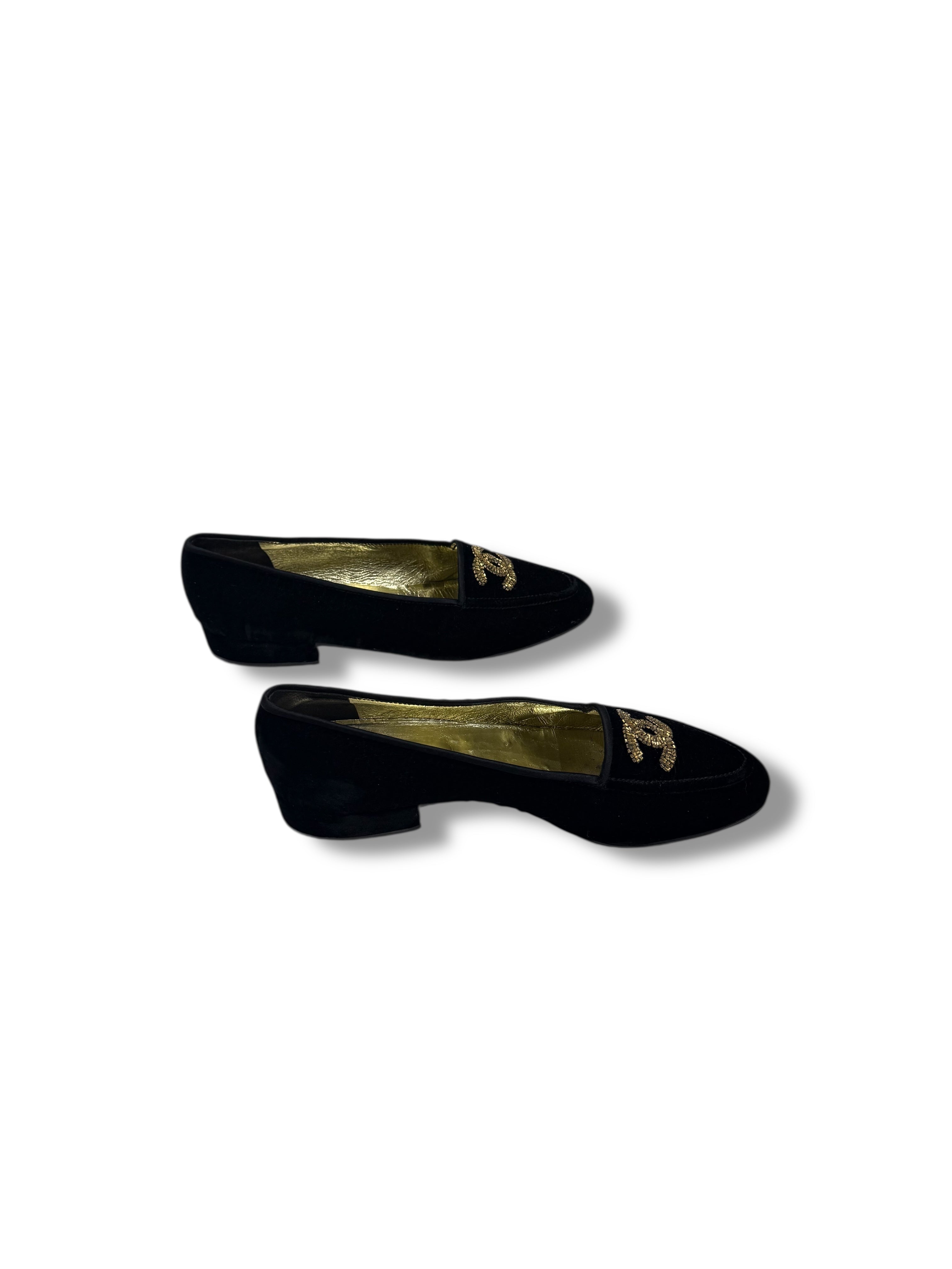Sublimes mocassins velours noir, avec logo CC sur l’avant en doré.