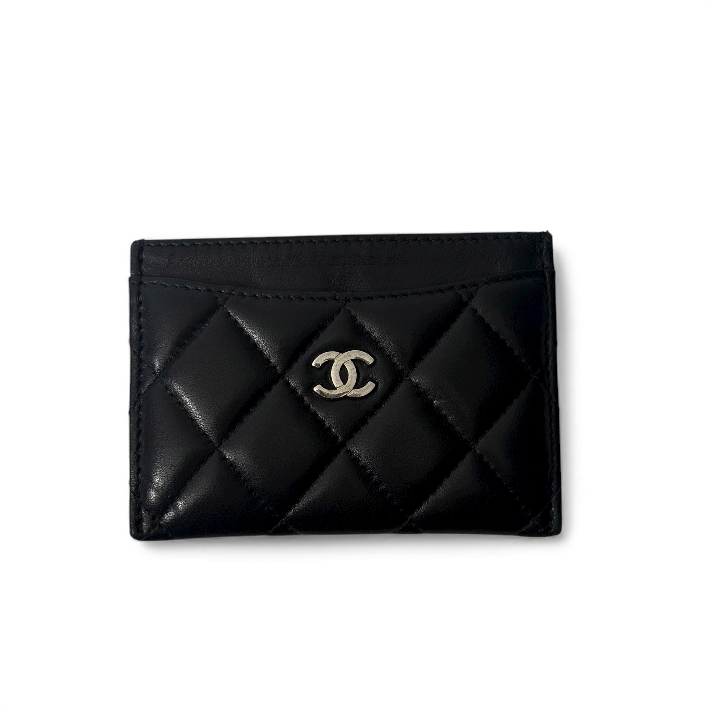 Porte carte en cuir d’agneau matelassé, un classique de la Maison, logo argenté.