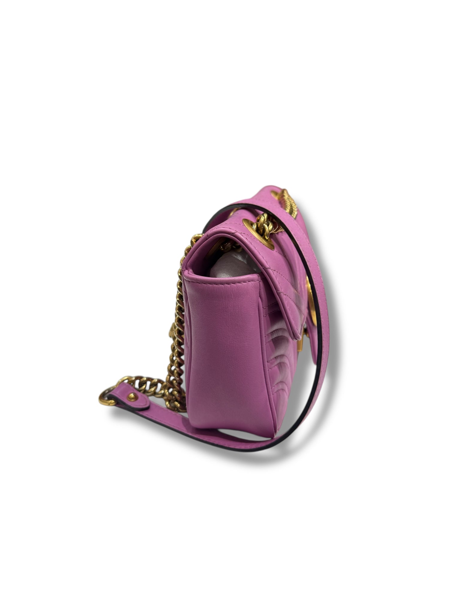 Le Gucci Marmont petit modèle en cuir rose lila séduit par son design doux et raffiné, son logo GG doré et son cuir matelassé au charme délicatement romantique.